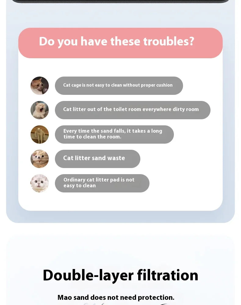 Say goodbye to scattered litter and messy floors with this Large Waterproof Double-Layer Cat Litter Mat. With its dual-layer design, non-slip base, and easy-clean surface, this mat catches litter, traps sand, and keeps the litter box zone tidy and comfortable.